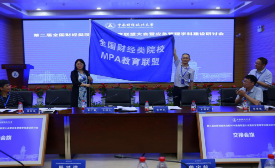 张红凤主任向大会介绍了我校MPA教育概况和办学特色,与参会高校重点研讨了财经类院校MPA的专业方向设置、培养方案的制定、导师队伍建设、课堂教学、案例教学、论文评审和答辩等。会议推选我校作为第三届全国财经类院校MPA教育联盟大会承办单位,并进行了会旗交接仪式。