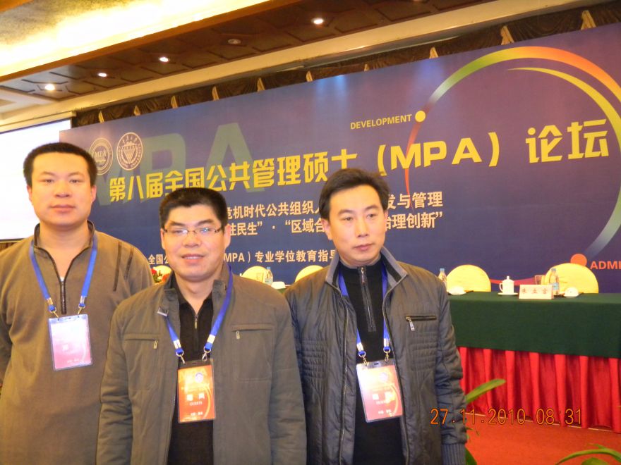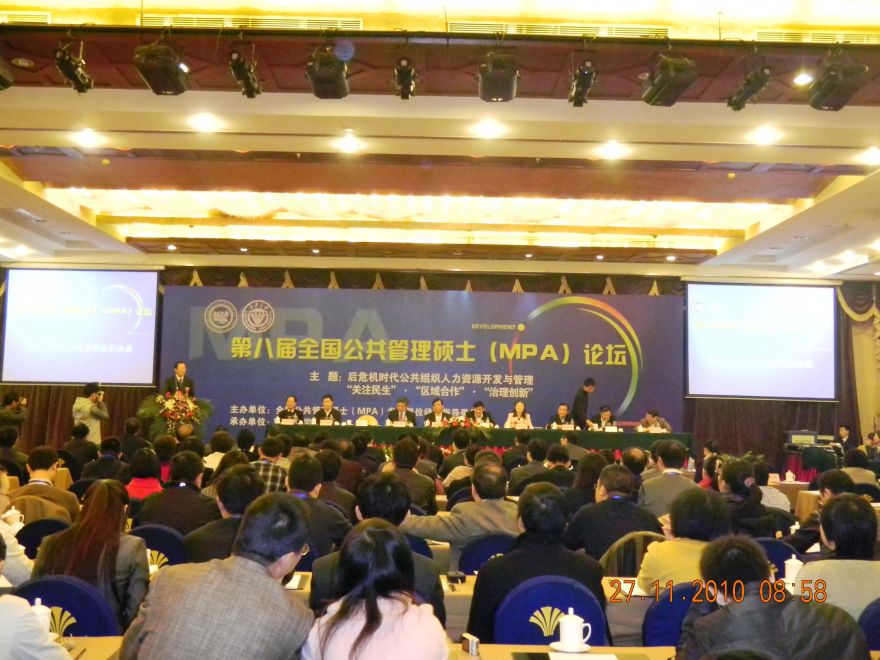2010年11月27日—28日,第八届全国公共管理硕士(MPA)论坛在重庆君豪大饭店隆重举行。本届论坛由全国公共管理硕士(MPA)专业学位教育指导委员会主办,重庆大学承办,重庆大学贸易与行政管理学院及重庆大学MPA教育中心负责会务执行。论坛的主题为:后危机时代公共组织人力资源开发与管理“关注民生”、“区域合作”、“治理创新”。同时,还举办了“城乡统筹发展中的公共服务均等化”、“和谐社会中的社会保障”、“干部选拔与培养”、“绩效评估与政府绩效管理”、“公共管理中的网络参与”、“突发事件与公共危机管理”和“公共治理与打黑除恶”七个主题分论坛。来自全国88所MPA培养院校的268人参加论坛,创下该论坛举办以来参加人数的新纪录。我校选派MPA教育中心石钟毓老师以及魏金栋、李德然两名MPA研究生参加了本次论坛。