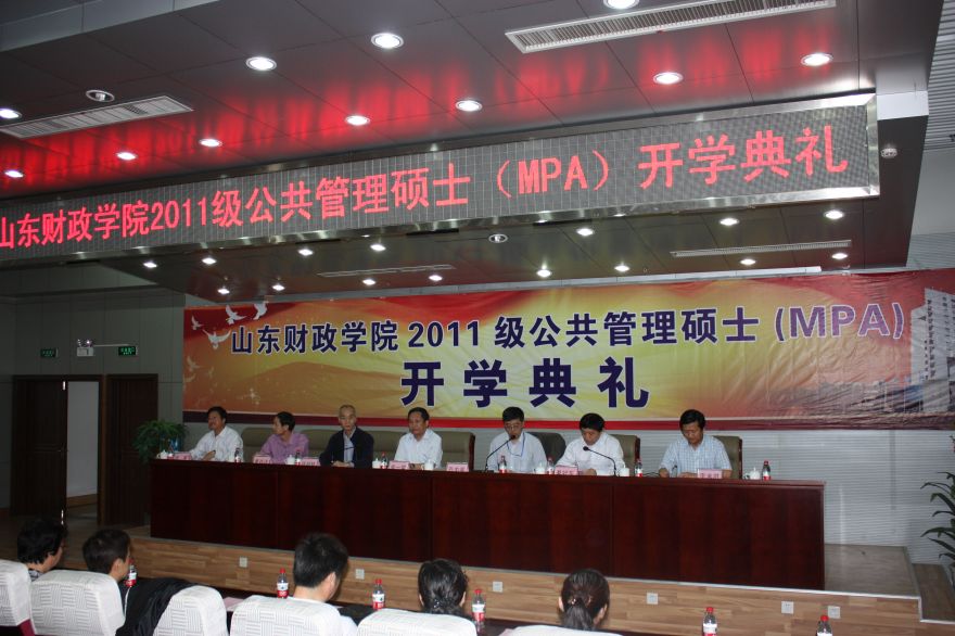2011年5月19日,山东财政学院2011级公共管理硕士(MPA)研究生开学典礼在国际交流中心(天舜大厦)三楼文华堂隆重举行。出席本次开学典礼的嘉宾有全国MPA专业学位教育指导委员会委员、哈尔滨工业大学管理学院副院长、博士生导师齐中英教授,北京大学政府管理学院副院长、博士生导师徐湘林教授,山东省国家税务局教育处夏存洋调研员等。山东财政学院党委书记袁一堂教授、副院长綦好东教授,研究生处处长李来胜教授,财税与公共管理学院院长、MPA教育中心主任岳军教授,财税与公共管理学院全体领导、部分教师及2011级全体MPA研究生出席了典礼。开学典礼由副院长綦好东教授主持。