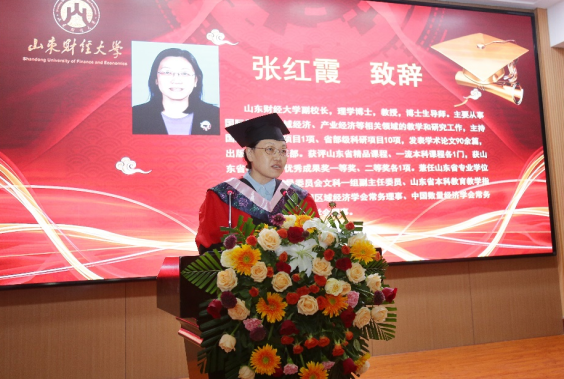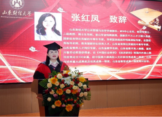 山东财经大学副校长张红霞首先致辞,她向121名MPA毕业生致以热烈的祝贺和诚挚的祝福,她说:在山财大求学的日子里,大家亲历了国家发展与世界巨变,珍惜这来之不易的大好机会,坚定理想信念,在实现中华民族伟大复兴中国梦的道路上接续奋斗、勇攀高峰。她鼓励大家:一是终身学习,把握求知的主动。二是创新突破,把握立业的主动。三是爱国报国,把握人生的主动。她希望同学们心怀“少年负壮气,奋烈自有时”的高远抱负,弘扬“克明俊德、格物致知”的校训精神,脚踏实地、勤勉耕耘,将奋斗的青春之花绽放在祖国和人民最需要的地方,并表示母校永远是毕业生坚强的后盾和精神家园。
