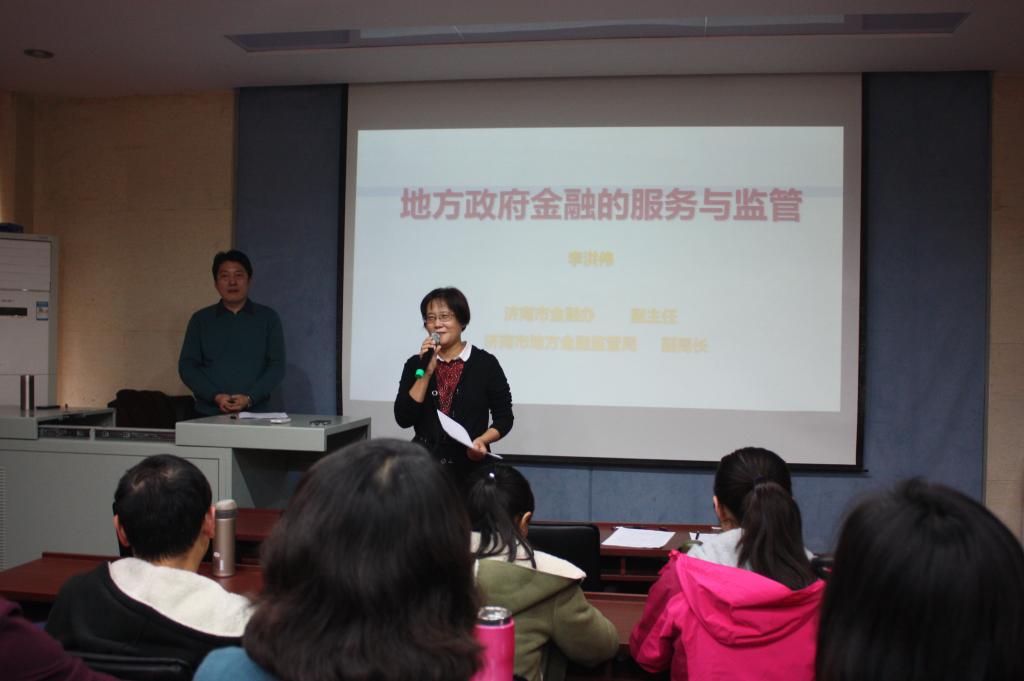 11月12日下午,济南市金融办副主任、济南市地方金融监管局副局长、山东财经大学MPA校外合作导师李洪伟应MPA学院邀请,在研究生楼二楼MPA教室为2016级MPA双证研究生作了题为《地方政府金融的服务与监管》的学术报告。报告会由MPA学院副院长徐晓雯教授主持。