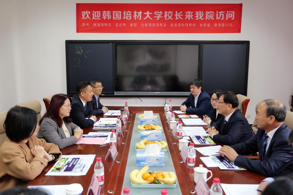 (通讯员:张彬)11月7日,韩国培材大学校长金善在、对外协力处处长崔镐澤一行5人到我院访问,学院党委书记李国强、院长兼MPA中心主任张红凤及相关领导、工作人员参加会谈,会谈由党委书记李国强主持。
