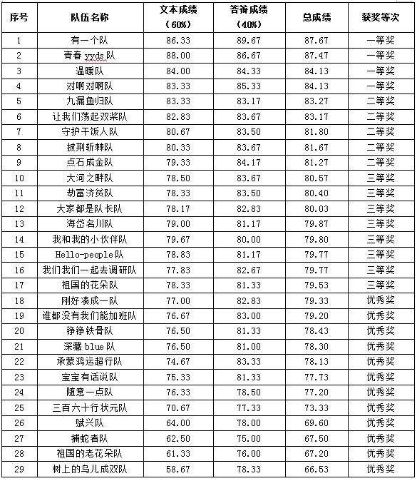 经过专家对参赛案例文本的评审,结合参赛队伍的答辩表现,按照“文本评分占60%,线上答辩评分占40%”的规则,汇总计算最终成绩。最终共有17支队伍分获我校案例精英赛一、二、三等奖,12支队伍获得优秀奖。获得我校案例精英赛一、二、三等奖的队员及指导教师将依据《山东财经大学MPA 中心 案例开发与案例大赛支持办法(2021 修订)》文件内容获得相应奖励(具体发放说明另行通知)并代表学校参加省、地区、国家级比赛。