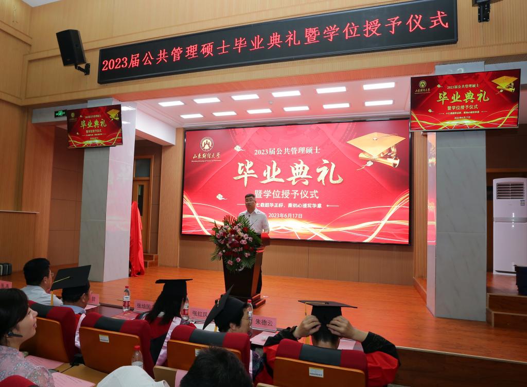 十七载韶华正好,秉初心谱写华章。6月17日下午,山东财经大学MPA中心在燕山校区三号楼报告厅隆重举行2023届公共管理硕士(MPA)毕业典礼暨学位授予仪式。山东财经大学党委副书记张培国,学生工作部部长杨哲,研究生院副院长刘若斌,财政税务学院朱德云、高凤勤、赵宝廷,公共管理学院曲衍波、徐宏、付冷冷,MPA中心主任张红凤,副主任张禹、学生管理部李旭日、教学管理部张雪以及2023届毕业生及亲友团等160余人参加此次活动,典礼仪式由MPA中心副主任张禹主持。
