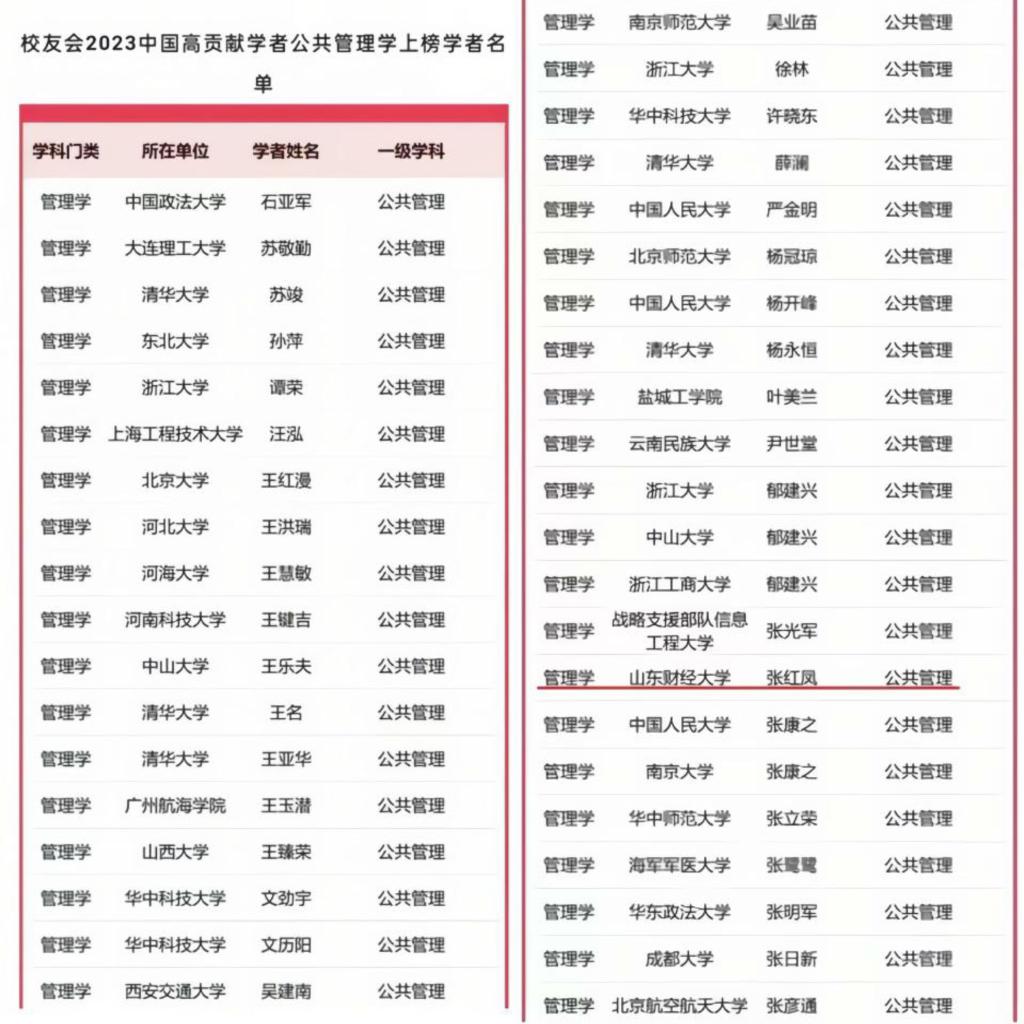 近日,全国第三方大学评价机构艾瑞深校友会网最新发布校友会2023中国高贡献学者完整名单,全国高校共有6917名杰出学者入选。其中,公共管理学上榜学者87名,我校公共管理与法学学部部长、MPA中心主任、泰山学者特聘教授张红凤入选“中国高贡献公共管理学学者榜单”。