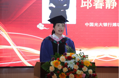 2024届毕业生代表、中国光大银行潍坊奎文支行党支部书记、行长邱春静分享了自己在山东财经大学MPA中心的求学经历,真切地表达了对校园生活的不舍与留恋。呼吁同学们一定要谨记财大的校训“克明峻德、格物致知”,感恩母校栽培,不负青春使命,带着属于财大人的荣耀,在平凡的岗位上筑起不平凡的财大梦、强国梦,做母校最棒的代言人!