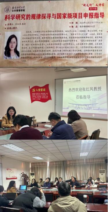 27日下午,张红凤主任一行前往南京财经大学公共管理学院展开调研,南京财经大学公共管理学院院长黄建伟、副院长汪栋、张丽芳以及学院青年教师参加了座谈会。张红凤主任从历史沿革、师资队伍、研究方向、研究成果、人才培养等方面详细介绍了公共管理与法学学部和MPA中心的基本情况,双方围绕学科体系、学科平台、合作交流等方面展开了深入探讨。随后,与会人员共同参观了南京财经大学公共管理学院办学成效展和科研实验室。座谈结束后,张红凤主任为公共管理学院师生开展了题为“科学研究的规律探寻与国家级项目申报指导”的专家讲座。张红凤主任围绕“顶天立地”的科研目标、“气韵风雅”的科研灵魂和“一以贯之”的科研素养等方面,向与会师生分享了自己从事科学研究的发展轨迹和心得体会,并结合自己的成功经验从项目选题、课题论证、思路设计等方面讲授了国家级项目申报书的撰写技巧。会后,与会人员就科研团队建设、研究方向凝练等相关问题进行了深入交流。
